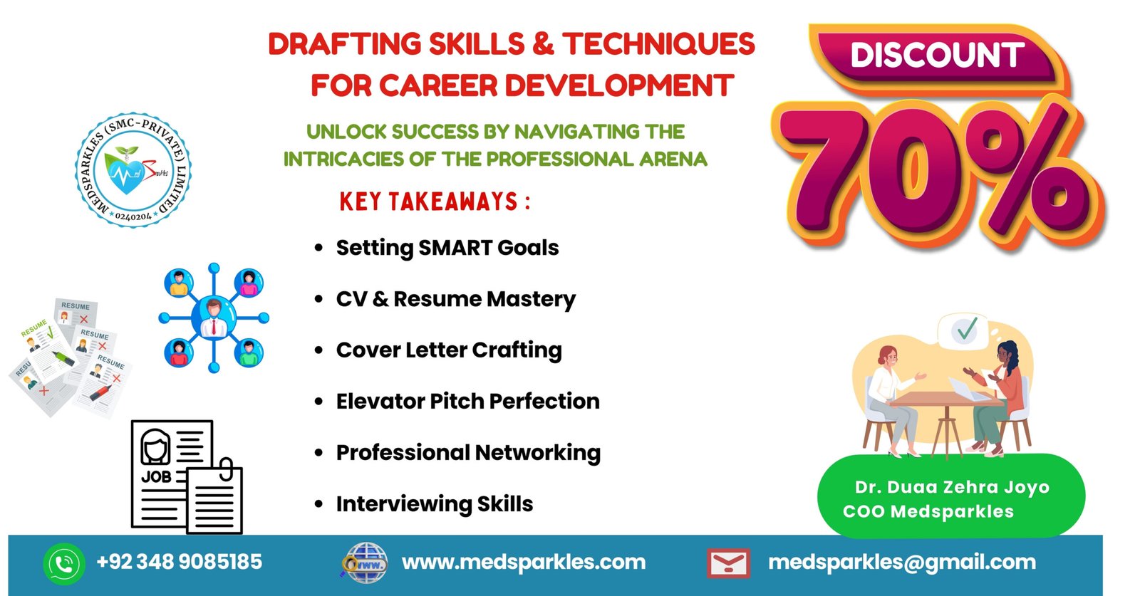 Graphic Designing, Career Development, Job Haunting Process, WordPress, First Aid and CPR, Professional Networking, Dose Calculations and Adjustment, BMR, Medical Emergency Management, Freelancing.